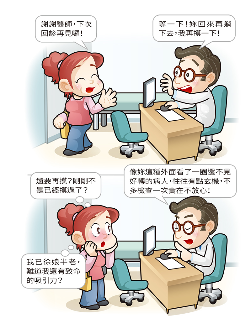病人愣住了,心想:「還要再摸?剛剛不是已經摸過了?」臉上帶點尷尬,又忍不住懷疑:「我已徐娘半老,難道我還有致命的吸引力?」
