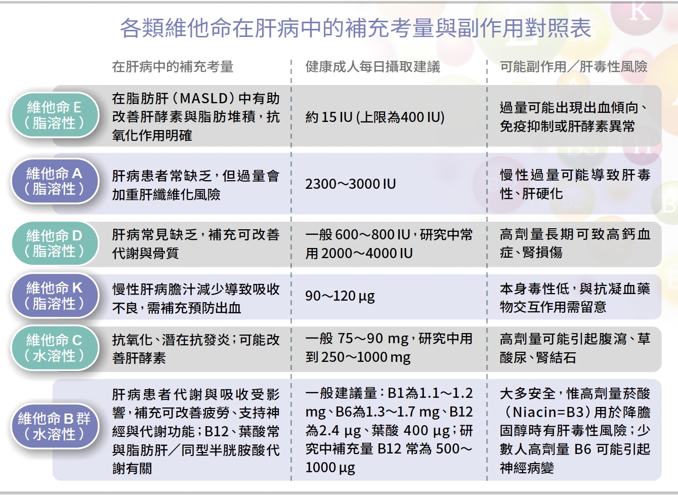 雖然研究指出,脂溶性維他命如E、A、D、K的缺乏常見於肝病患者中,且維他命E在脂肪肝中可能改善肝酵素與組織變化,但過量補充仍可能對肝臟造成負擔。特別是脂溶性維他命在體內易累積,肝功能異常者代謝功能多半不良,風險更高。水溶性維他命雖較易排出,但若劑量過高仍可能對腎臟造成負擔,甚至干擾代謝。