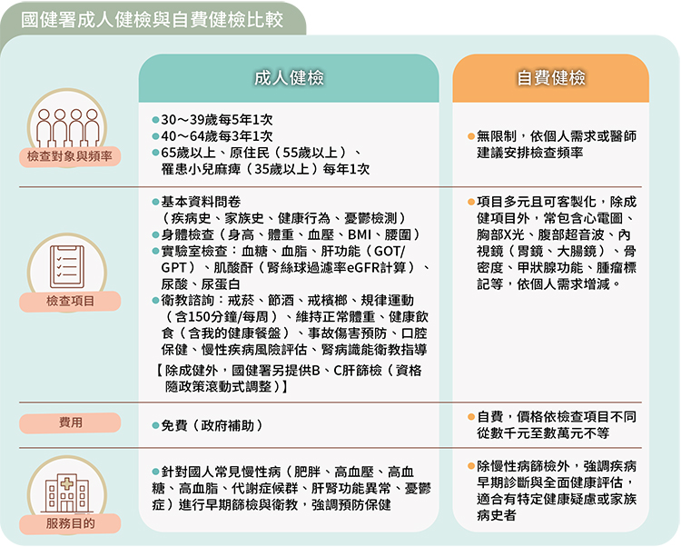 相較之下,自費健檢則提供更為多元且深入的檢查內容,例如癌症篩檢、超音波、內視鏡、各類影像學檢查等,能夠根據個人需求進行客製化選擇,適合希望獲得更全面、細緻健康評估的族群。不過,若資源有限或時間不允許,至少應善用政府提供的成人健檢,落實最基本、最重要的健康把關工作。即使沒有進一步選擇自費健檢,單是定期接受成人健檢,對於早期發現慢性病、降低未來重大健康風險,已經是守護健康最實在且不可忽略的基礎行動。