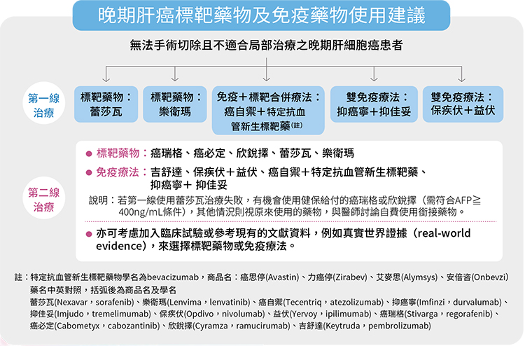 近年來晚期肝癌的治療有很大的進步,第一線藥物除了較早問世的標靶藥蕾莎瓦(sorafenib)、樂衛瑪(lenvatinib)外,還有免疫加標靶(即atezolizumab+bevacizumab,俗稱為A+B或double A)、雙免疫療法(durvalumab+tremelimumab)。美國食品藥物管理局(FDA)又於2025年4月11日核准另一款雙免疫療法(nivolumab+ipilimumab),因此,目前晚期肝癌第一線治療共有5種選擇,其中,nivolumab+ipilimumab截至2025年6月底尚未經國內食藥署核准為第一線藥物,也尚未納入健保給付。