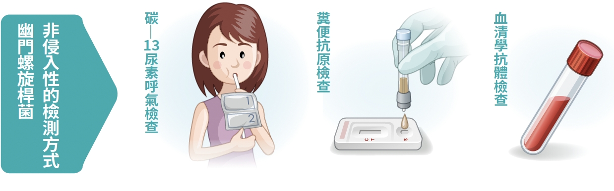 幽門螺旋桿菌的檢測方式包括碳-13尿素呼氣試驗、糞便抗原檢測及胃鏡檢查。至於血清學抗體檢測主要用於流行病學研究或健檢篩檢上應用,其結果若顯示陽性也僅表示曾被感染,不代表目前仍在感染中,因此若採用抽血方式可能會高估感染率。