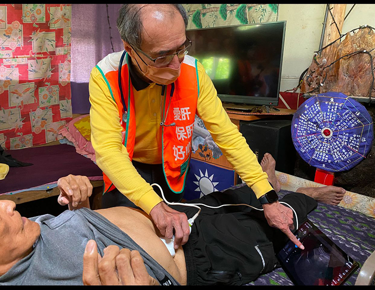 圖說2:肝基會嘉義分會陳啟益執行長至原民部落家訪,親自為民眾進行腹部超音波檢查。
