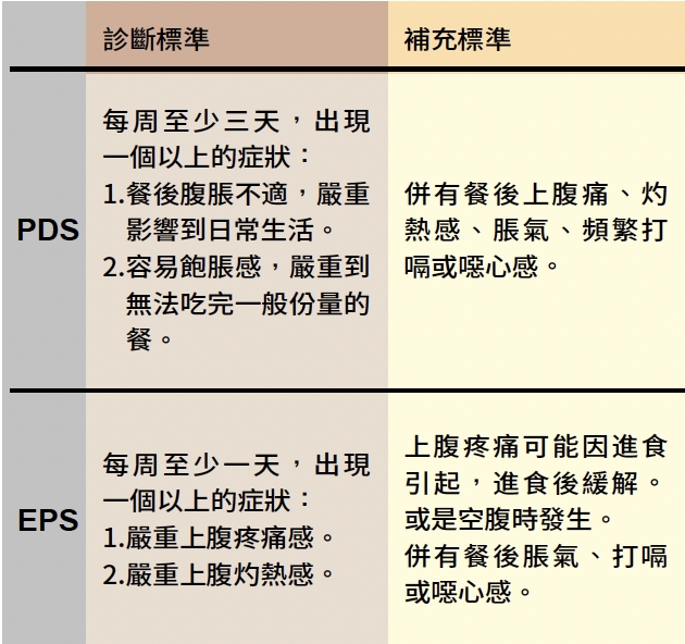 依據2016年發表的羅馬準則(ROME IV criteria),功能性消化不良的症狀需在診斷前6個月已發生,且於近3個月內持續存在,經檢查(包含內視鏡檢查)後,並無器質性病變。分為兩個亞型: